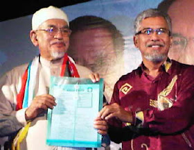 (Haji Mohd Sais menyerahkan borang kepada Ustaz Hadi dengan diperhatikan Pesuruhjaya PAS Johor, Datuk Dr Mahfodz)